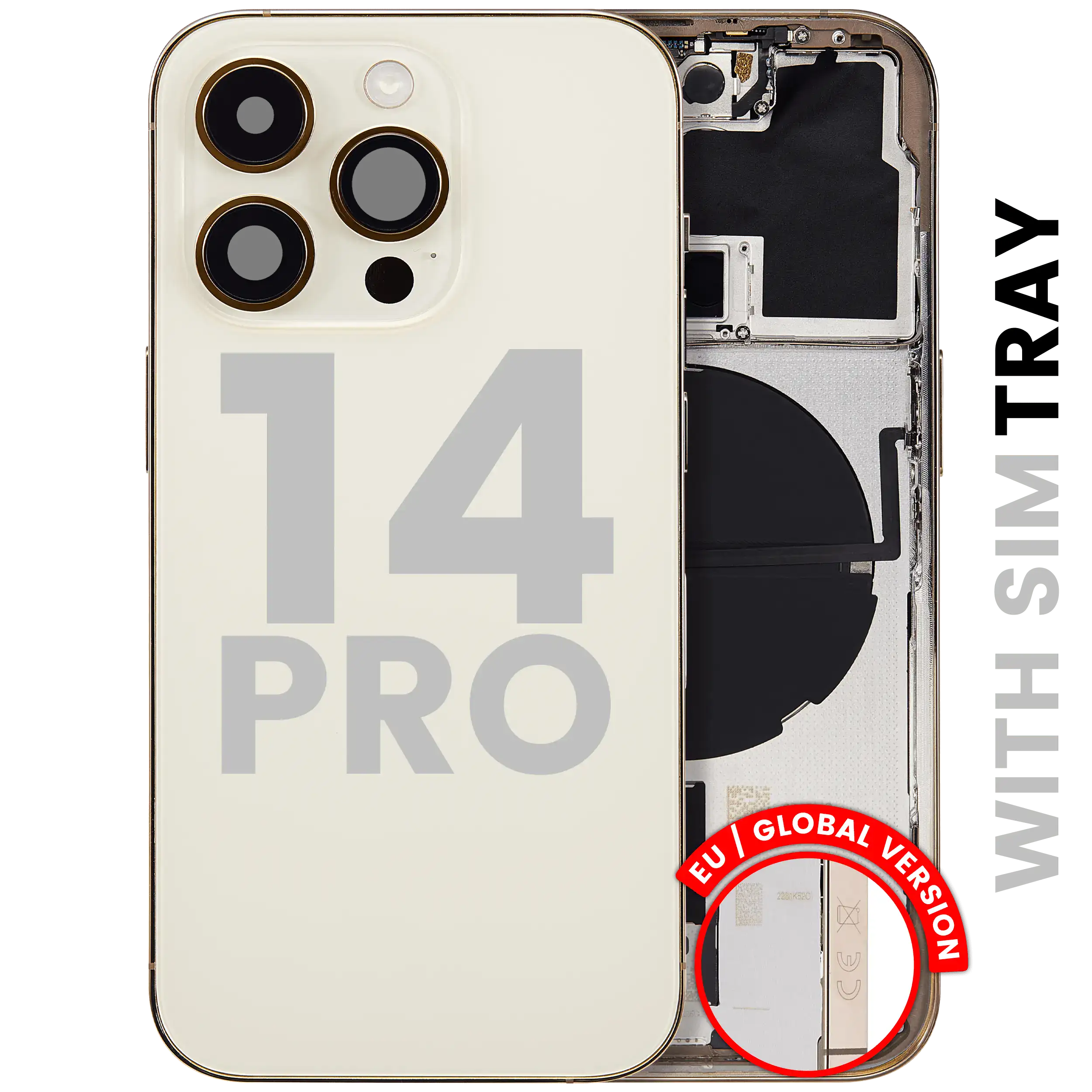 • Superb quality Back Housing W/ Small Components Pre-Installed for iPhone 14 Pro (International Version) (Used OEM Pull: Grade A) (Gold).