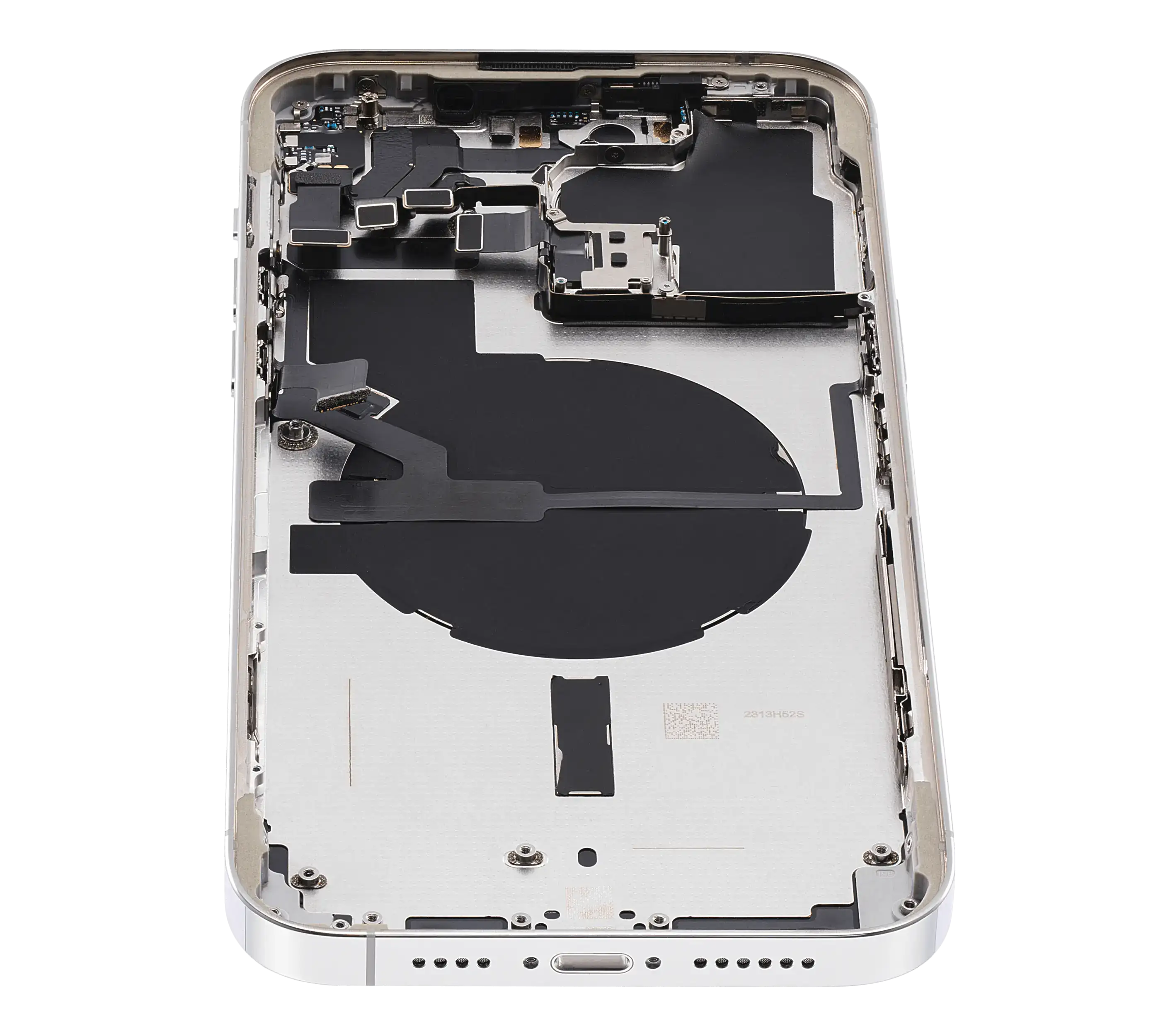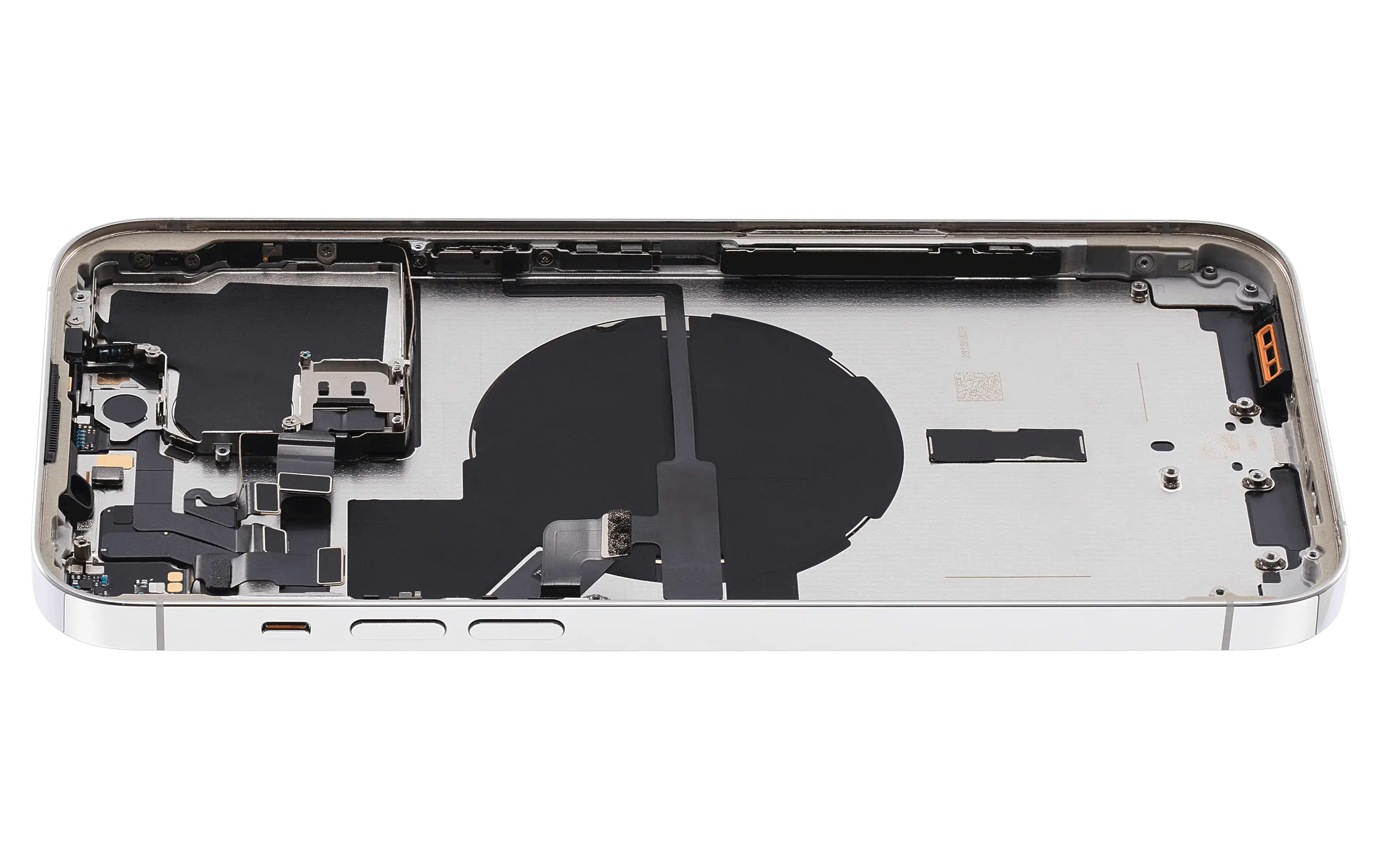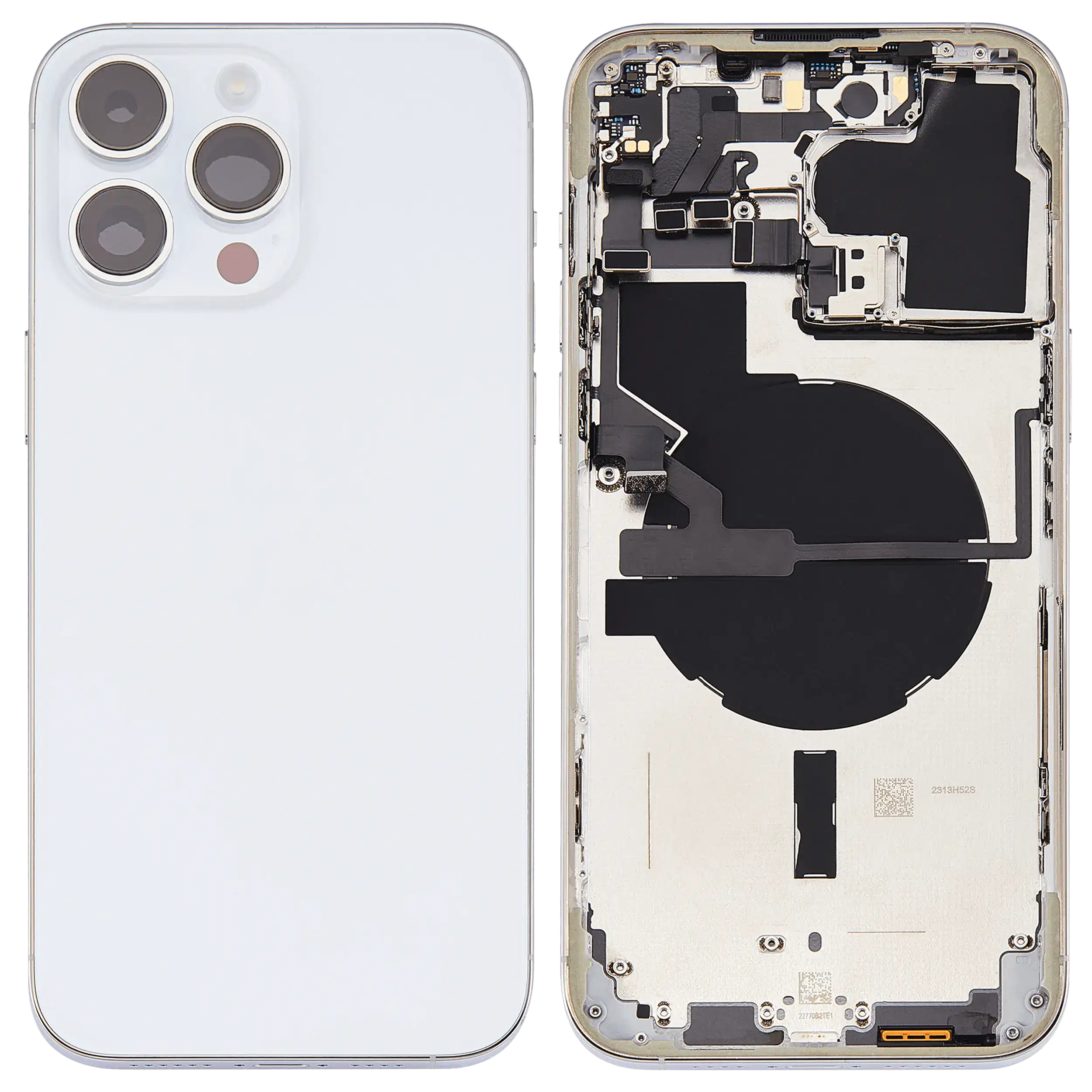• High quality Back housing for iPhone 14 Pro Max w/ small components pre-installed (U.S Version) (Used OEM Pull: Grade C) (Silver).