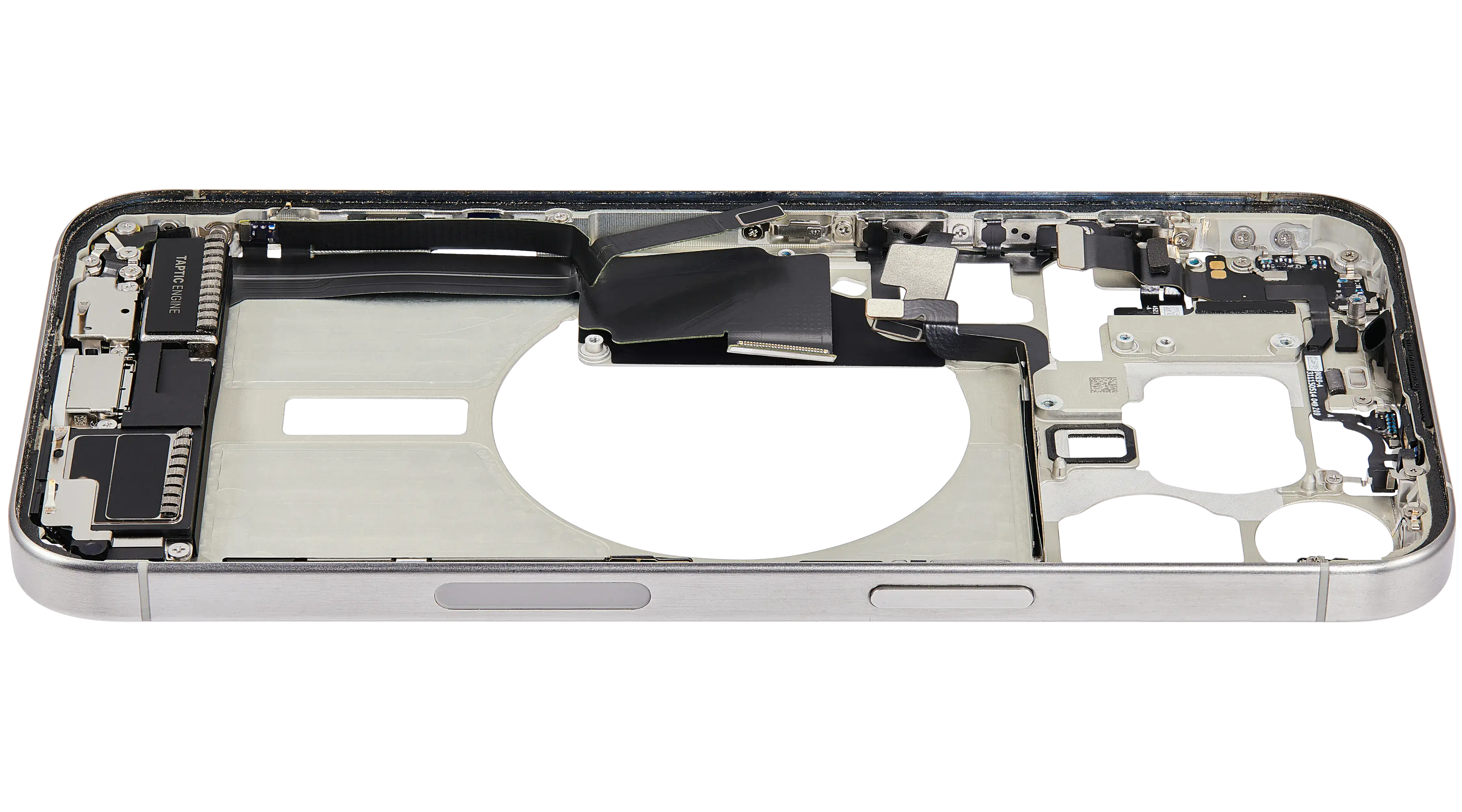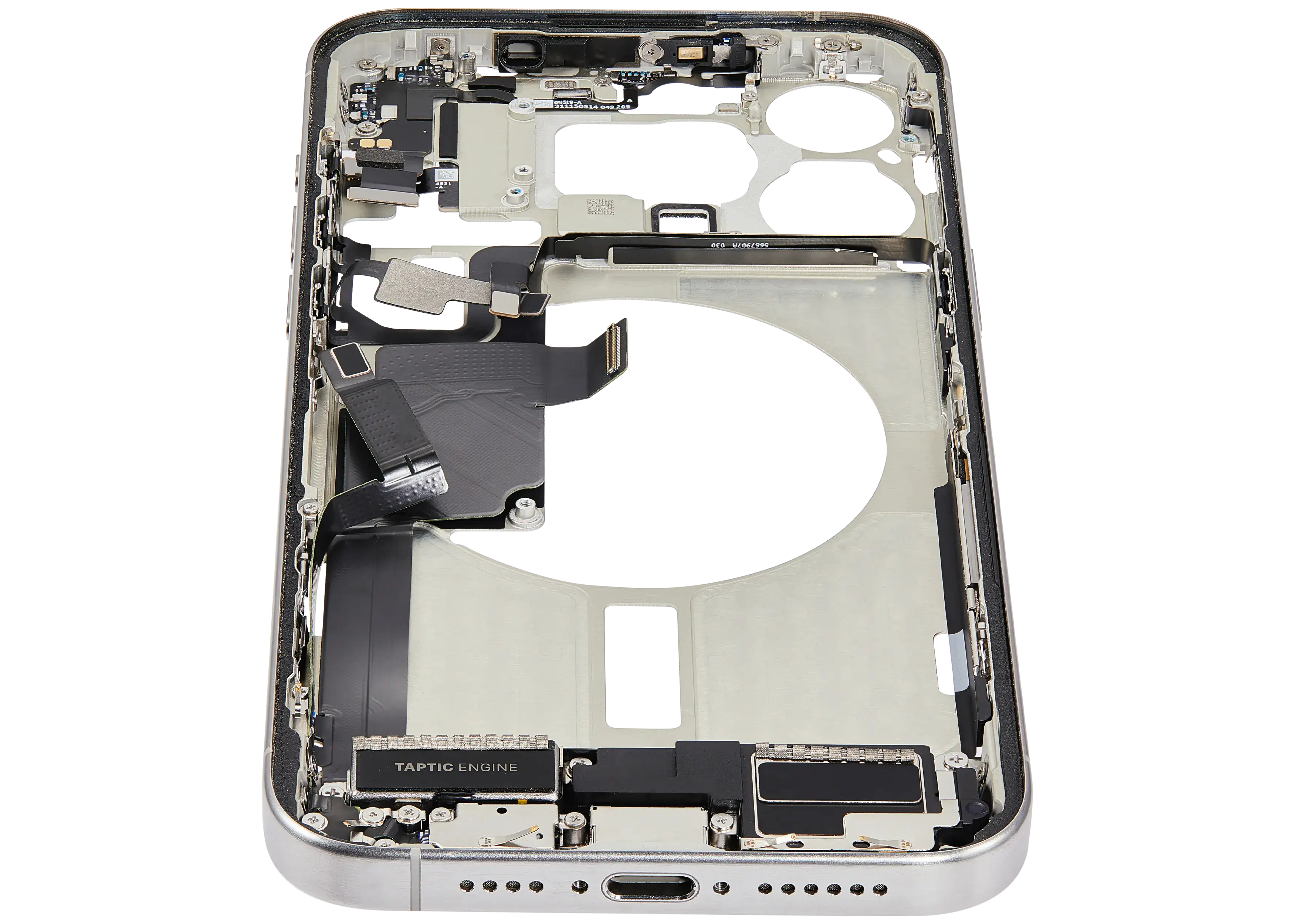 Mid-Frame Housing W/ Charging Port Flex & Small Parts For iPhone 15 Pro Max (US Version) (Used OEM Pull: Grade C) (White Titanium)