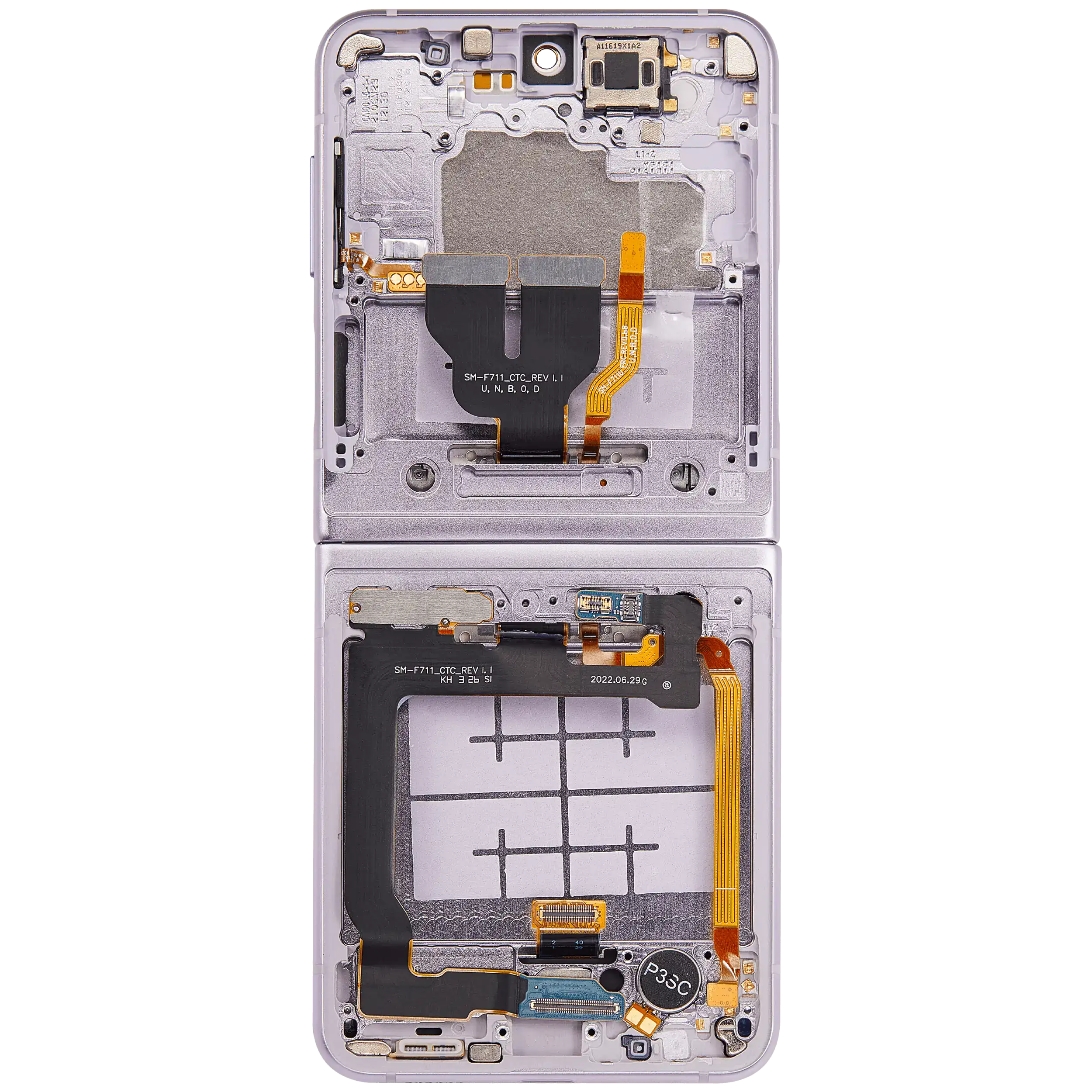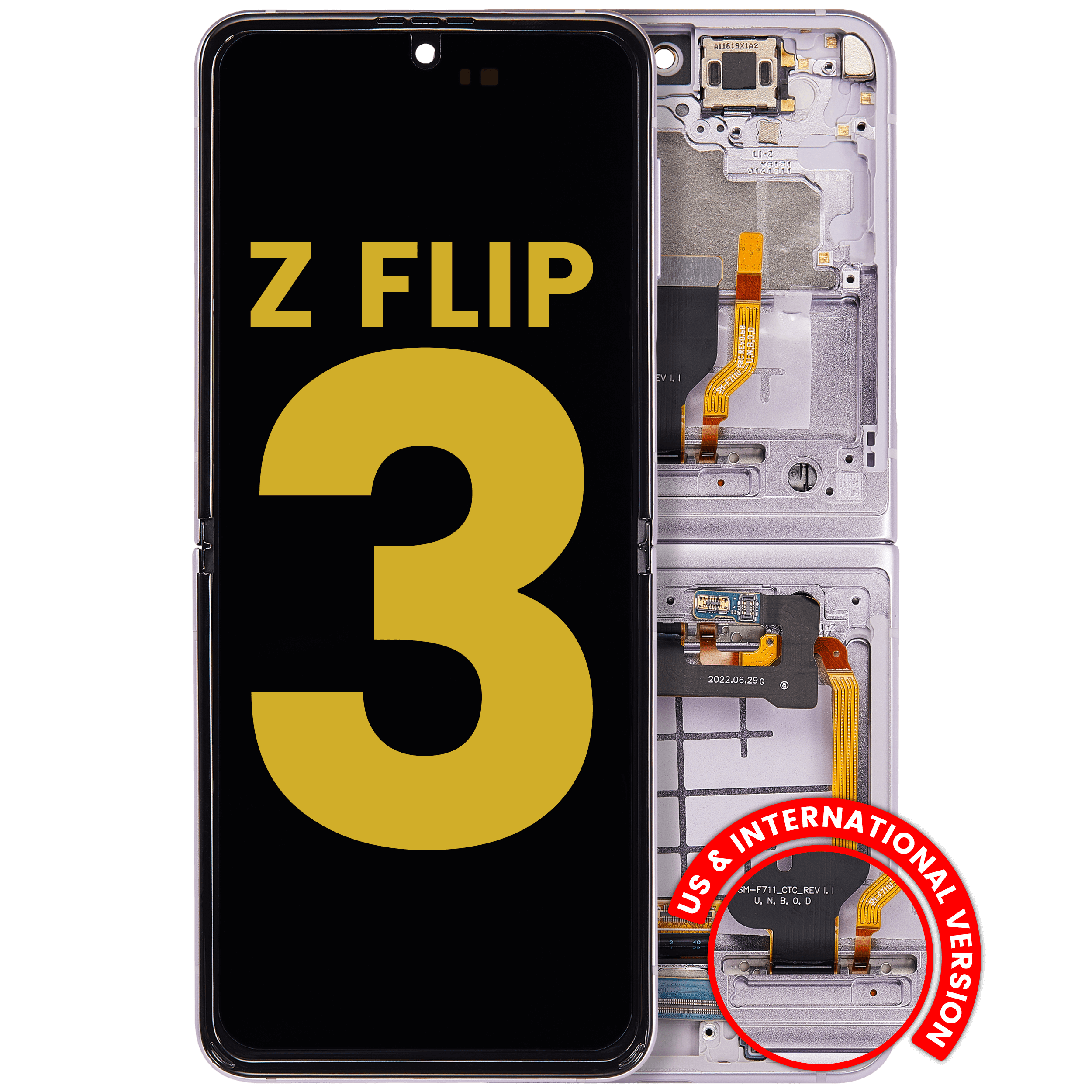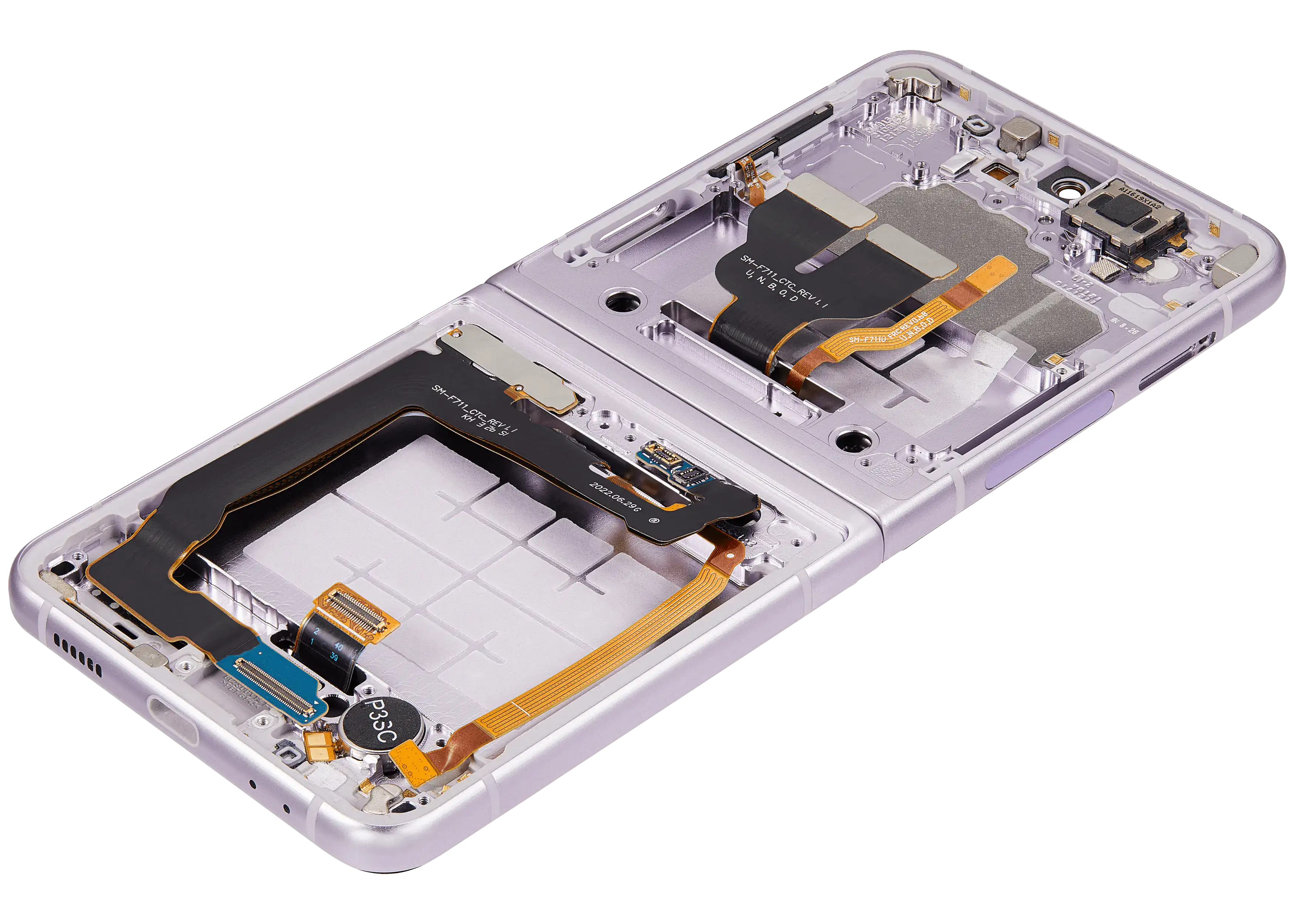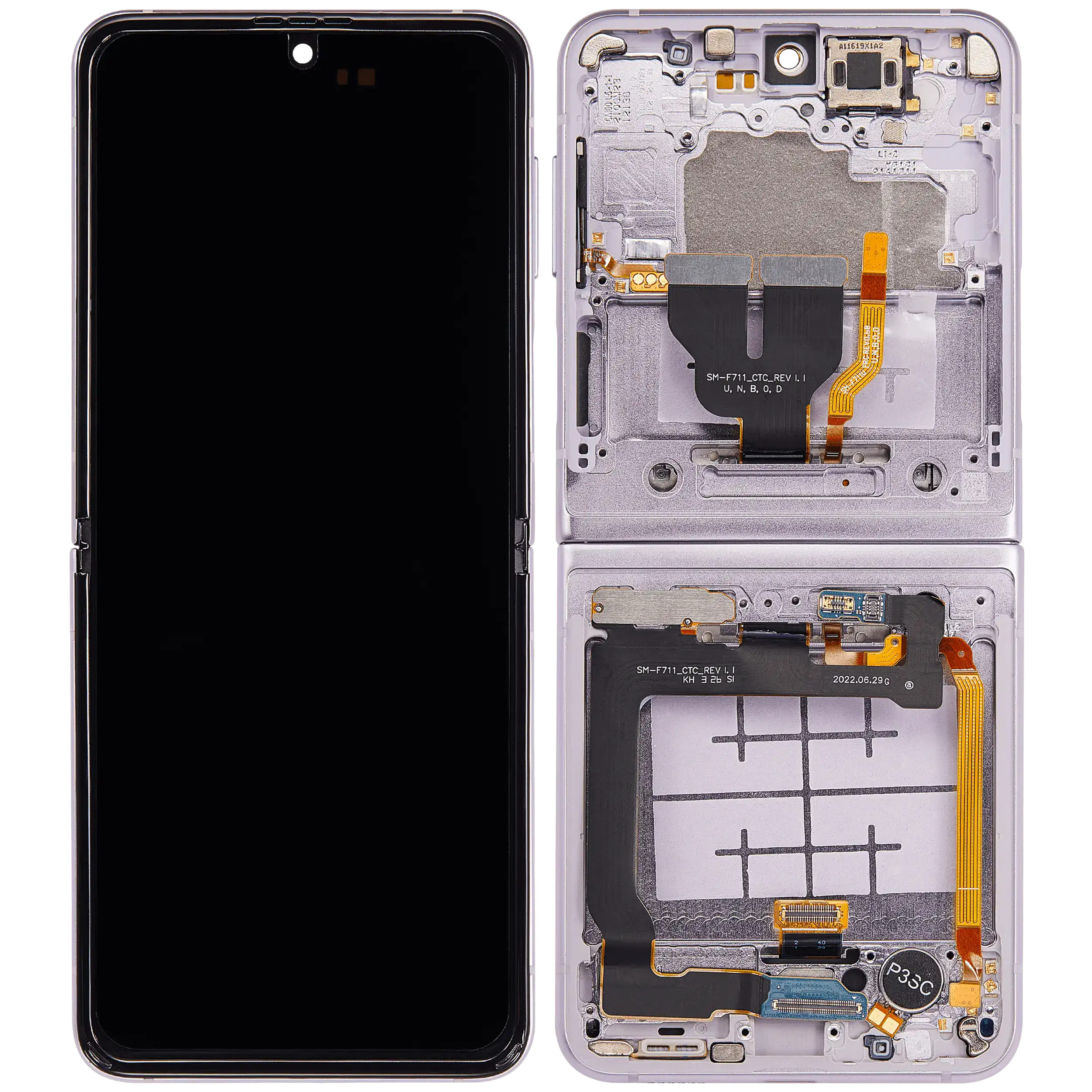 • High quality Inner OLED Assembly with frame replacement for Samsung Galaxy Z Flip 3 5G (US & International Version) (Refurbished) (Lavender).